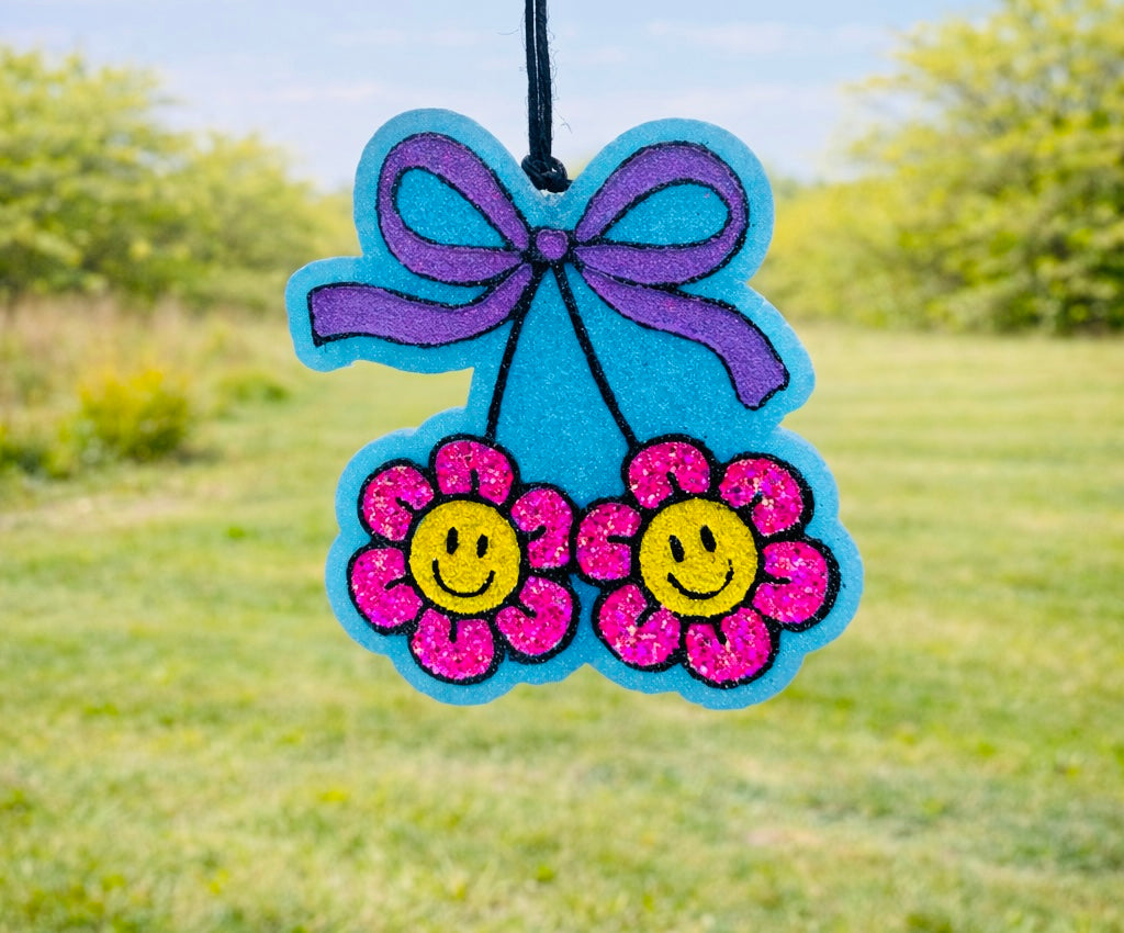 Featuring our flower cherry freshie. A playful and vibrant accessory for your vehicle. Perfect for anyone who loves cherries. The perfect summer freshie.