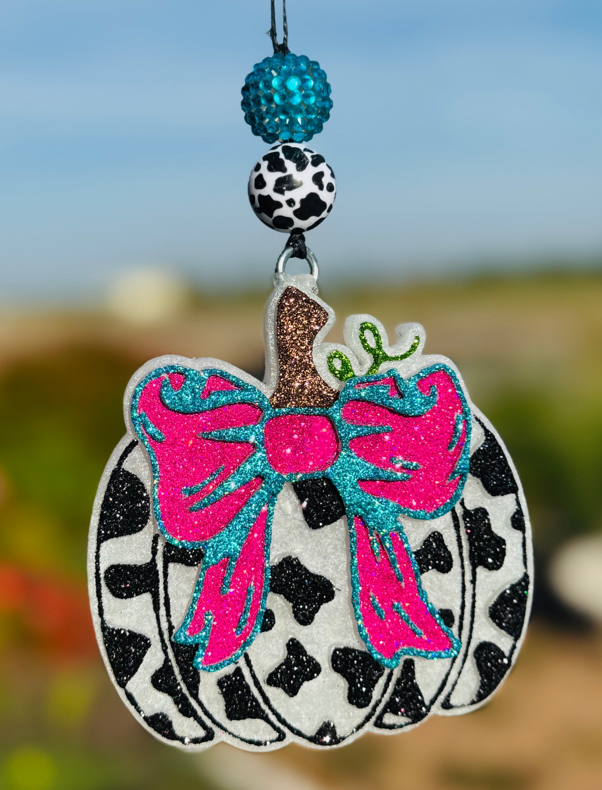 Featuring our Cow Print Pumpkin with bow car Freshie. Choose your custom scent from our posted scent list and enjoy this cute accessory in your home, office, or car!