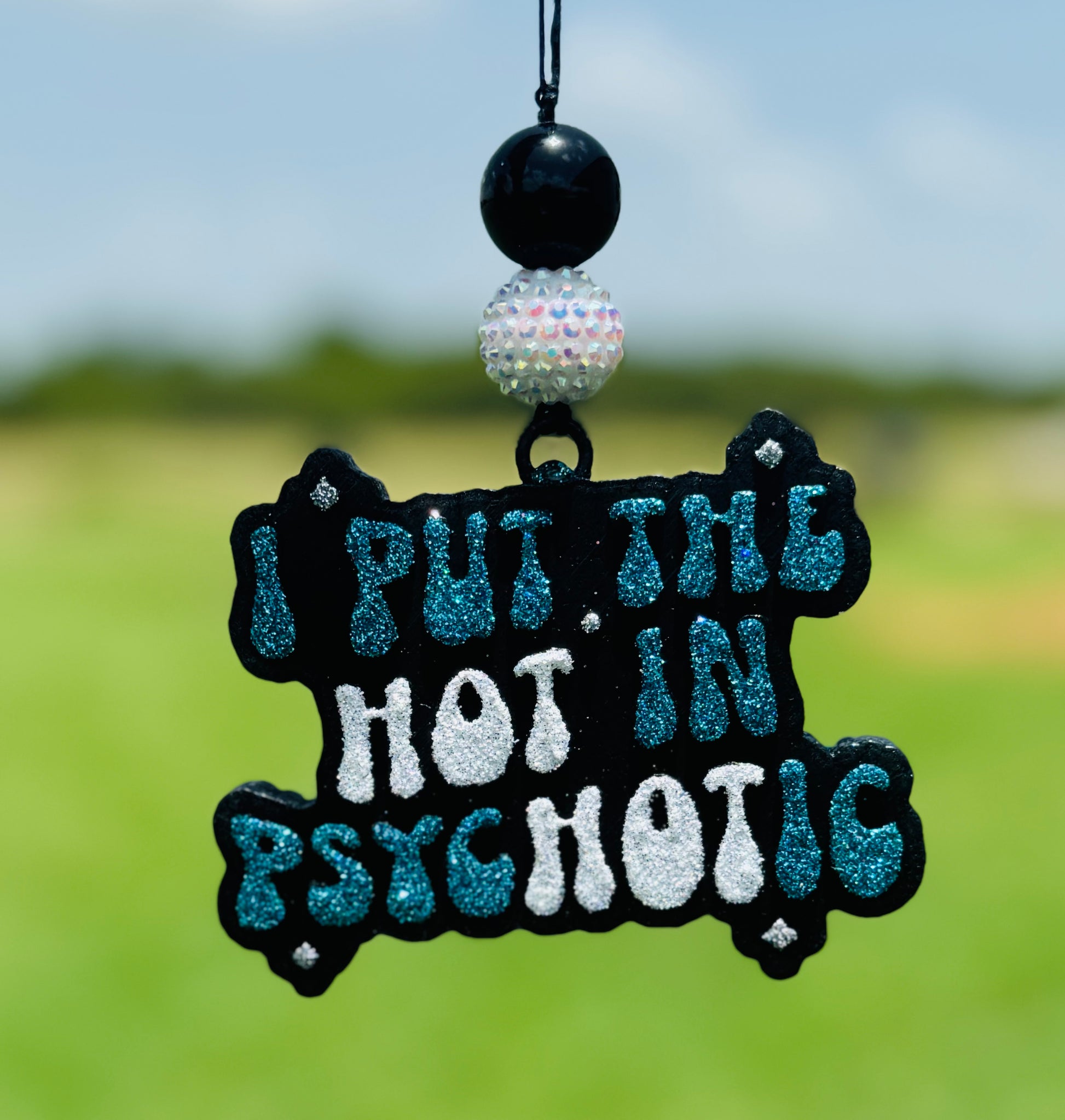 Featuring the "I put the HOT in psychotic" Freshie. A playful and stylish design.