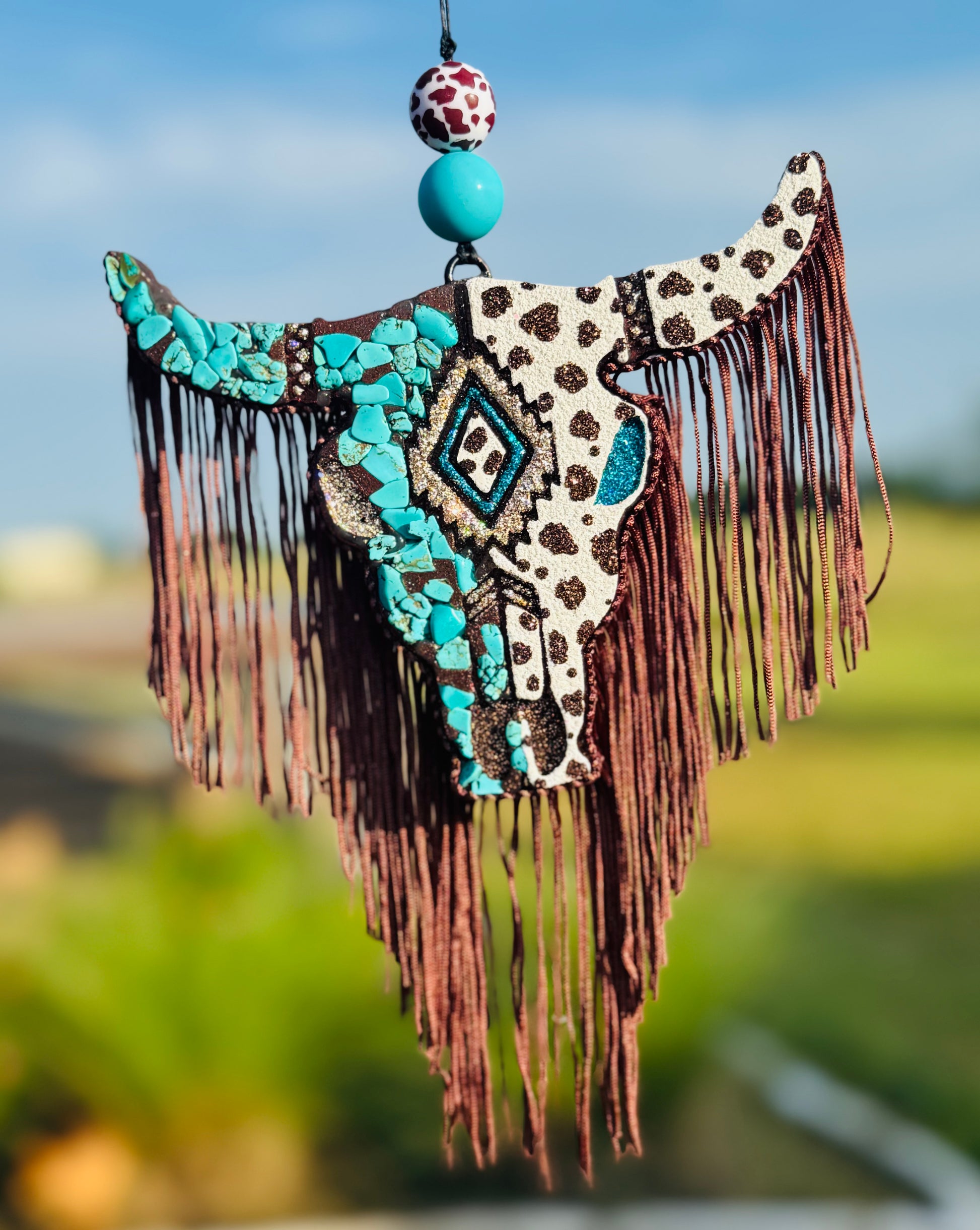 Featuring our LARGE sized Aztec bull. This design is perfect for those western lovers. The freshie makes a bold statement with its large size. Can be made with or without fringe.