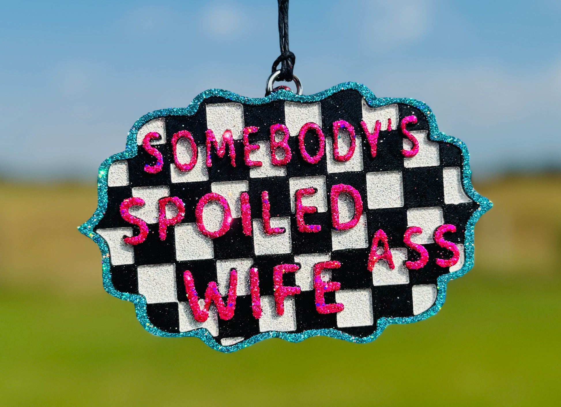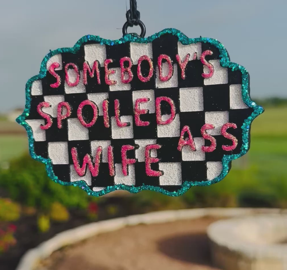 Featuring our Checkered Somebody's Spoiled Wife Freshie. Choose your custom scent from our posted scent list and enjoy this cute accessory in your home, office, or car!